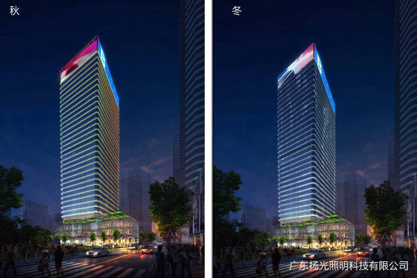 根據對建筑主體的解析,頂部在西北面設置LED顯示屏,東南面設置企業LOGO來增強建筑的標識度,立面采用燈管色勒,有效的表現出建筑龍骨結構的層次感,通過線條變化體現出城市高效發展的速度。
