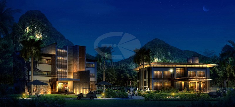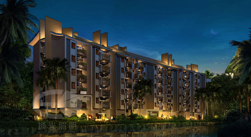 住宅燈光以靜謐的燈光氛圍為主,充分結合建筑特色,運用“點線面”燈光手法,強調建筑夜景特色。重點交代建筑頂部與入口在夜間的主次關系。