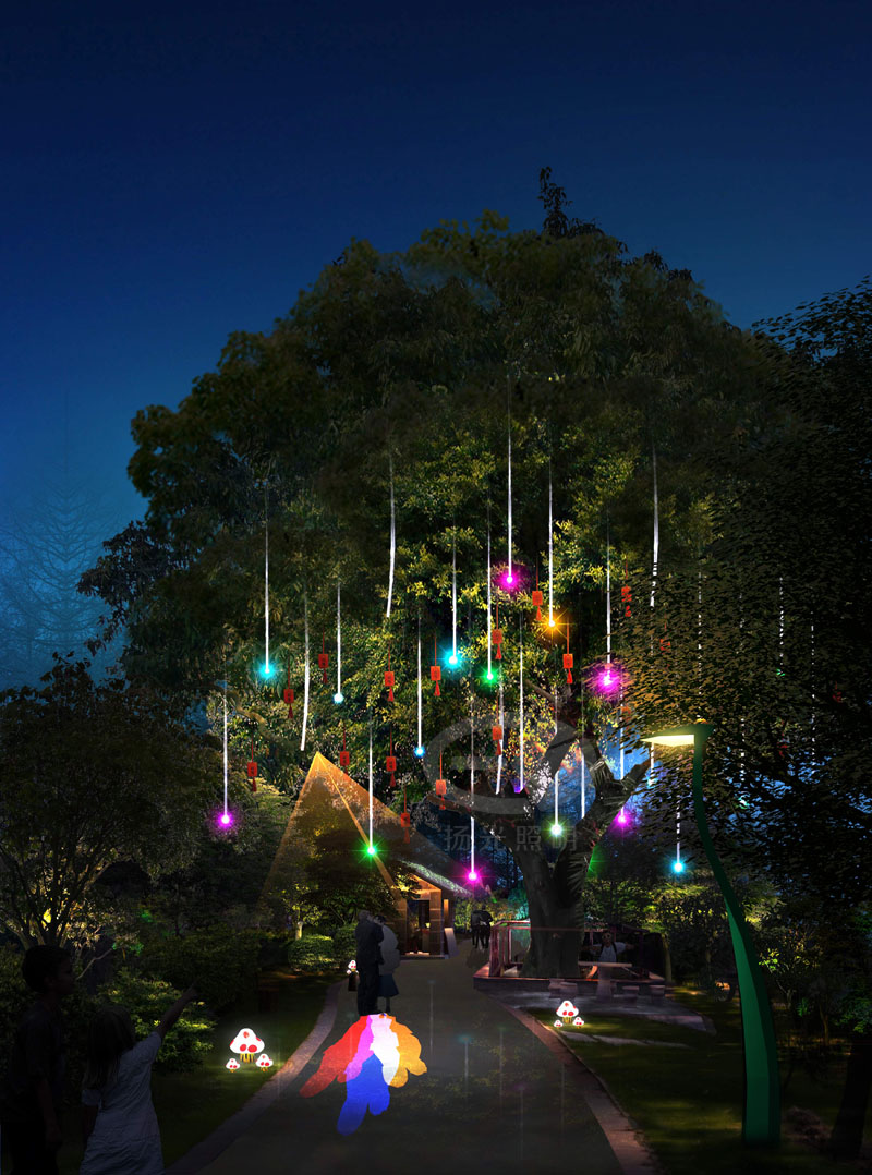 云陽水鄉區許愿樹夜間照度,在樹木投光照明基礎上,增加特色燈具設計,提取許愿條元素結合球形掛燈與流星雨燈具,保障許愿樹的日間效果,同時將許愿樹打造成夢幻的仙境之樹。