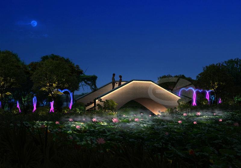 湖岸邊增加水上景觀雕塑——月相變換燈光雕塑,打造“荷塘月色水中映”的仙境。游船碼頭、水上棧道,在燈光設計上,兼顧功能性照明的同時,增添燈光色彩,打造七彩水上漫步之路。