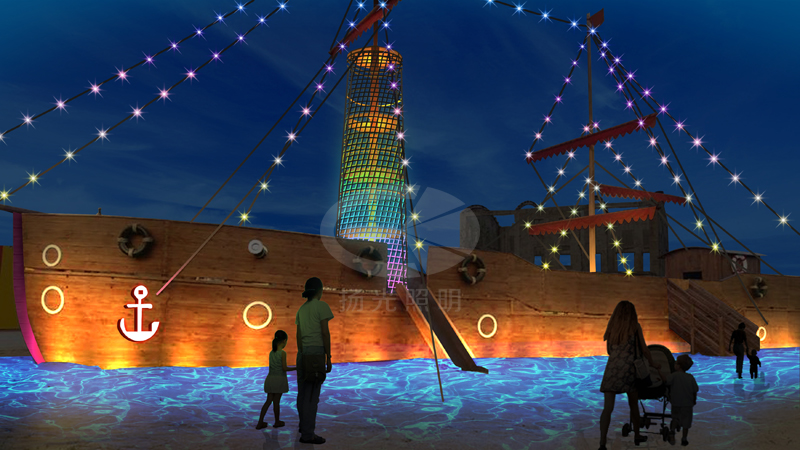 海盜船為兒童樂園中特色的游樂設施,燈光設計要營造繽紛、熱鬧、歡樂、精致的氛圍。