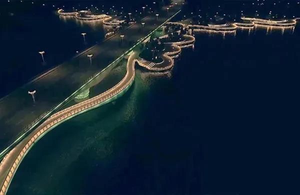 “波光瀲滟、百花擁簇”,通過燈光表現海面獨有的自然意境以及海花橋梁的形象特色。