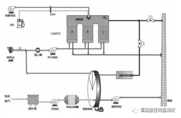 ③脫附-燃燒:達(dá)到飽和狀態(tài)的吸附床應(yīng)停止吸附轉(zhuǎn)入脫附再生,脫附后的廢氣進(jìn)入燃燒階段,即 RTO或 RCO廢氣處理工藝。